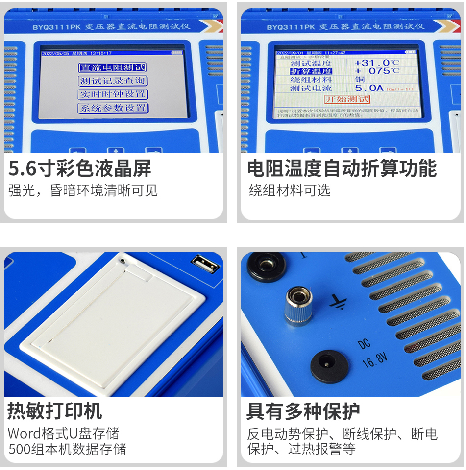 变压器的直流电阻是变压器制造中半成品、成品出厂试验、安装、交接试验及电力部门预防性试验的必测项目,能有效发现变压器线圈的选材、焊接、连接部位松动、缺股、断线等制造缺陷和运行后存在的隐患。佐航BYQ3111PK变压器直流电阻测试仪是一款创新型产品,内置大容量锂电池,产品体积小巧,便于携带。产品不仅适合变压器、互感器、电抗器等感性试品的测量, 而且适合铜排、导线、开关触点等阻性试品的测量,仪表测试速度快、准确度高。