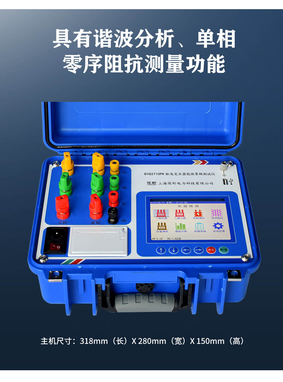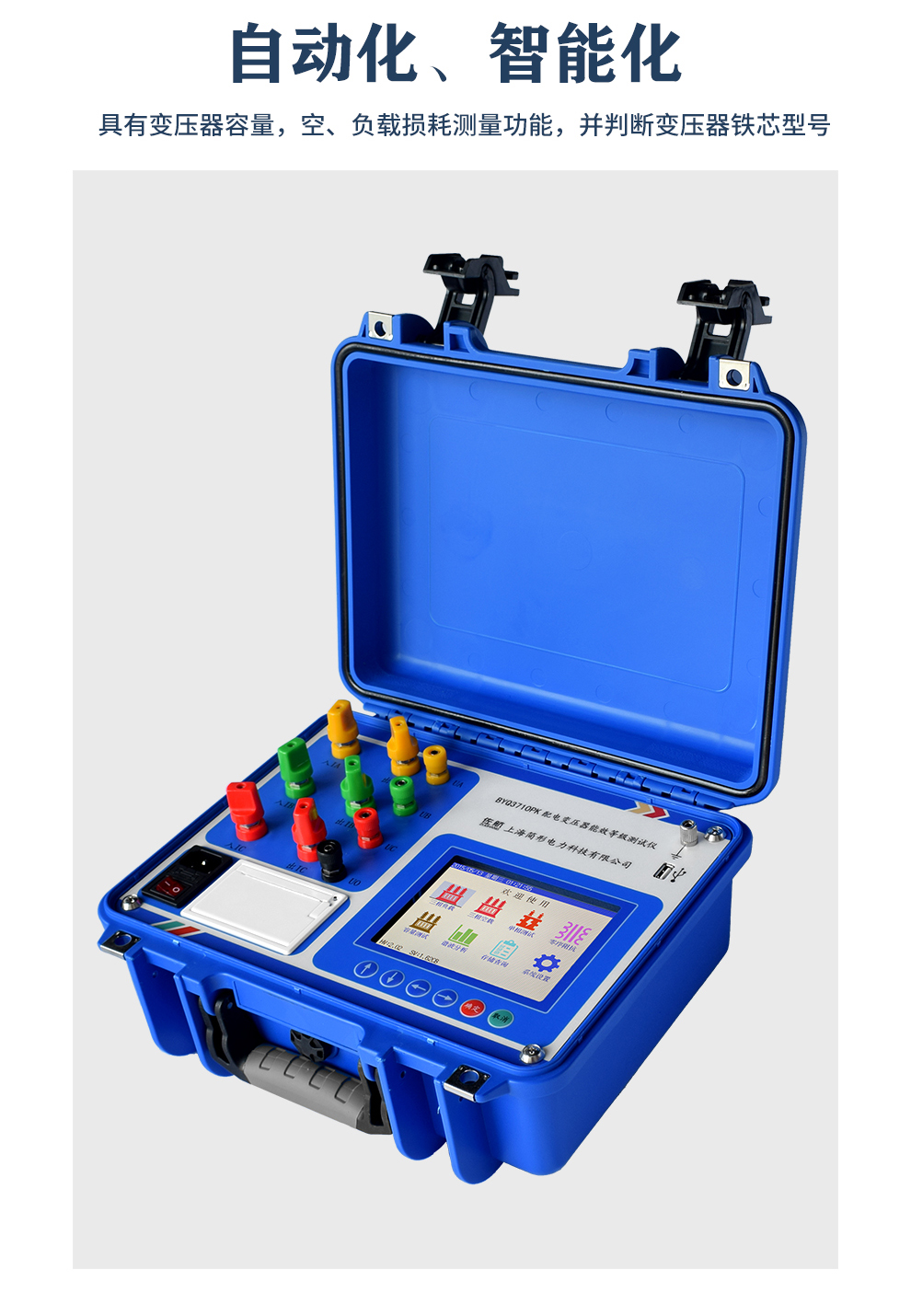 显示三相电压、三相电流、三相功率,自动计算出变压器的阻抗电压百分比,折算到额定温度、额定电流下的负载损耗,自动判断出油浸式或干式配电变压器的铁芯型号,测试过程中具有报警自适应提示功能,方便现场用户使用。