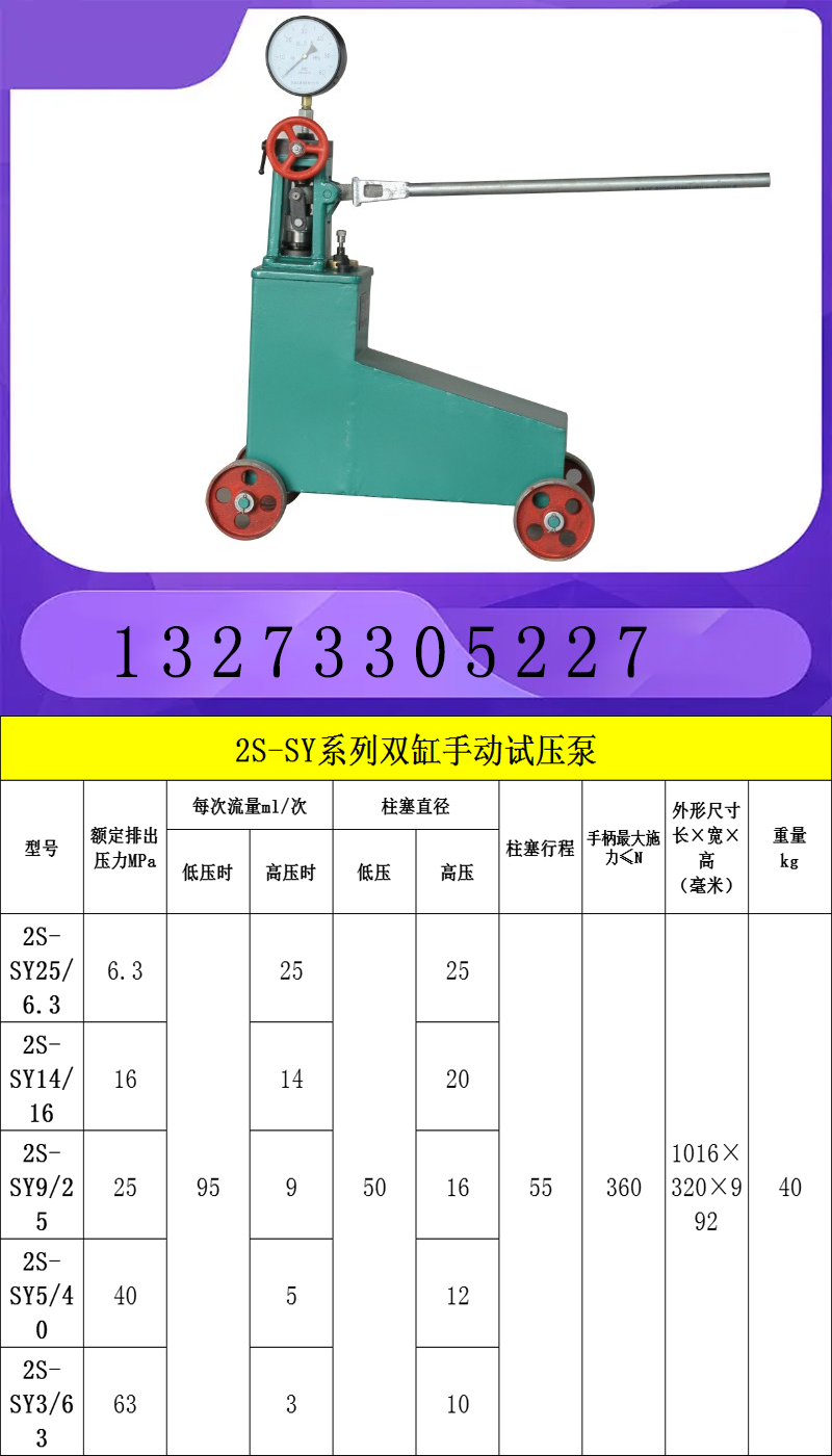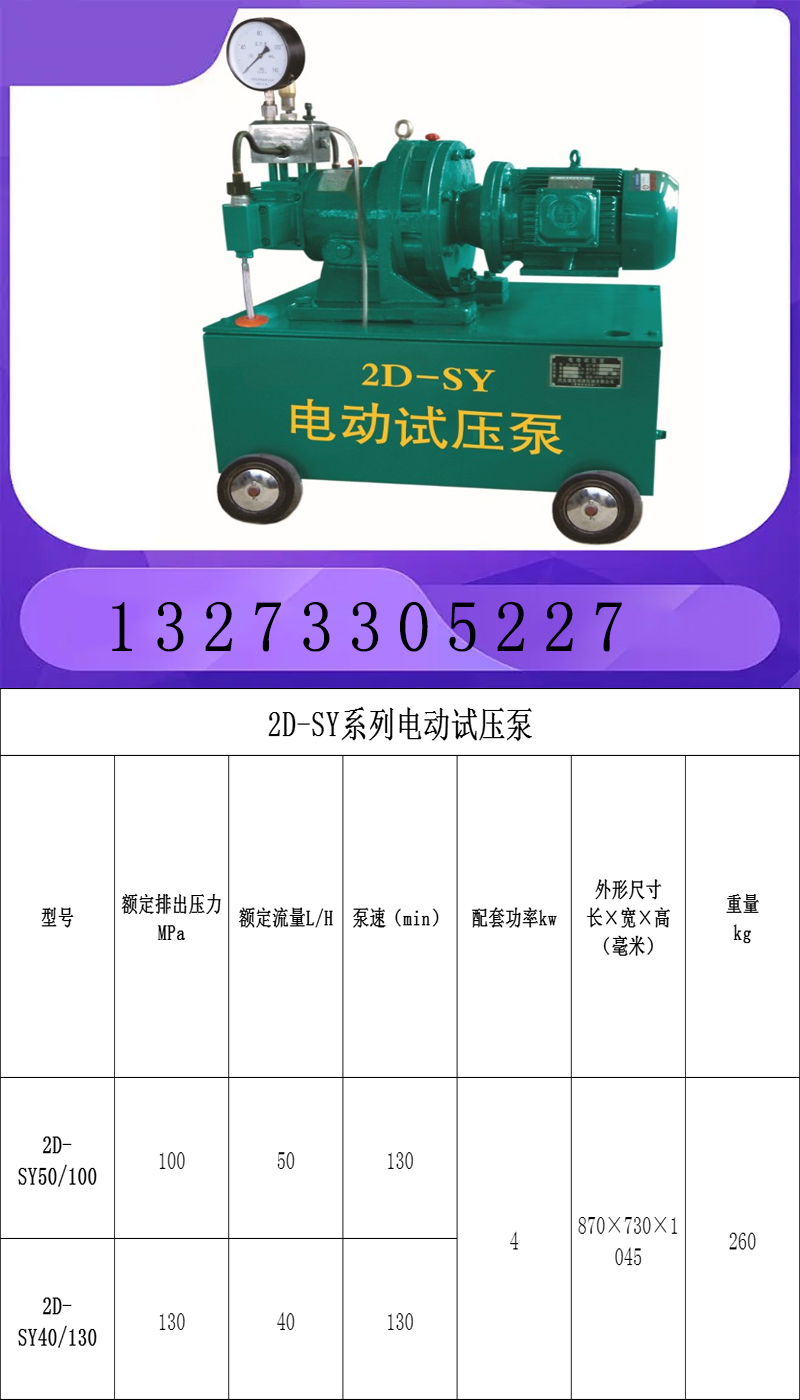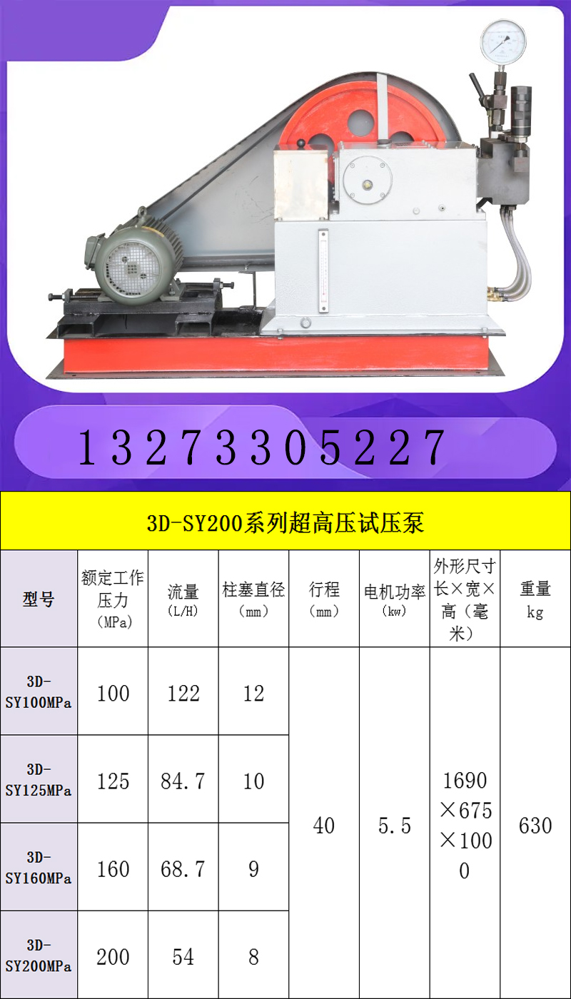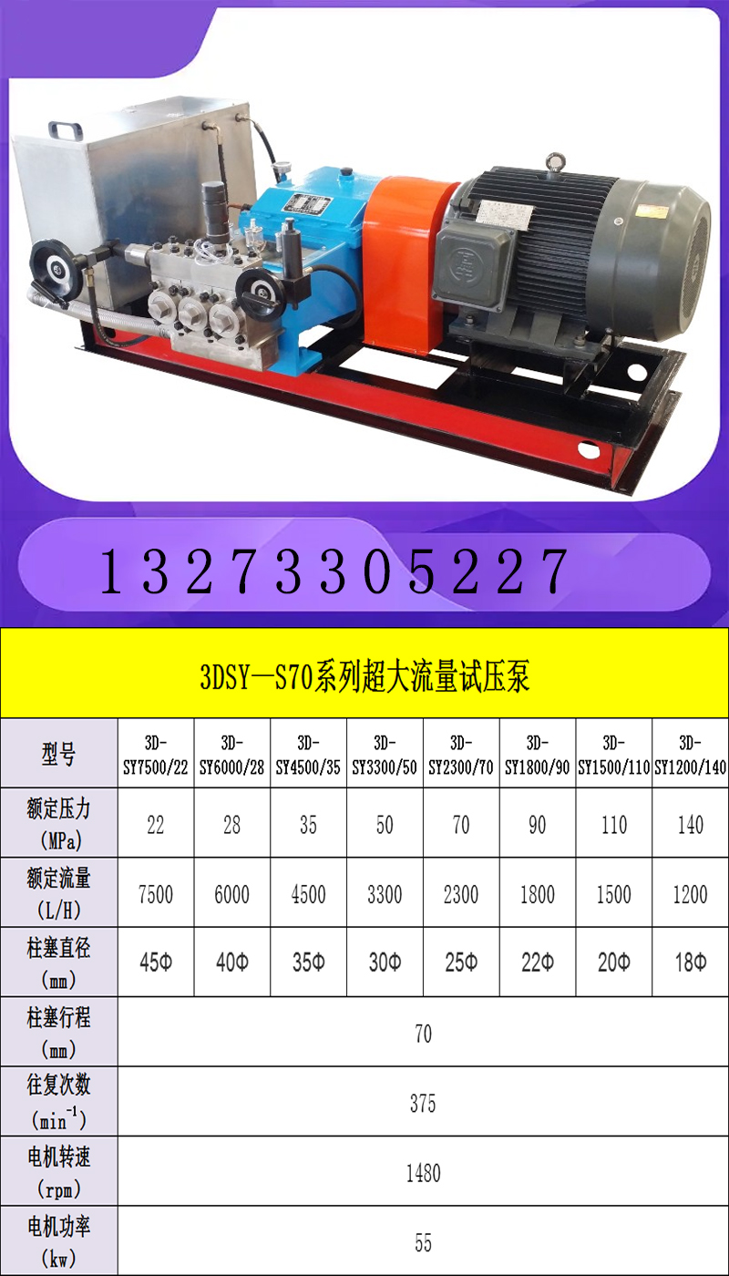 (欢迎来电了解详情——1-3-2-7-3-3-0-5-2-2-7)我厂研制生产的3D-SY750系列电动试压泵可用于各类压力容器、锅炉、管件等一切需作压力爆破试验和强度试验的场所,根据需要可锁定试验压力值,并能进行自动保压。泵的输送介质一般为常温清水,也可使用乳化液、防锈水及粘度与水相近的中性油品。配上清洗附件,该机还可作为清洗机使用。是我国目前现行二缸、四缸电动试压泵的换代产品。该产品具有体积小、结构紧凑、运行平稳、安全可靠、功能完备、流量大、效率高等特点,而且适用范围广、配套性强、操作简单。