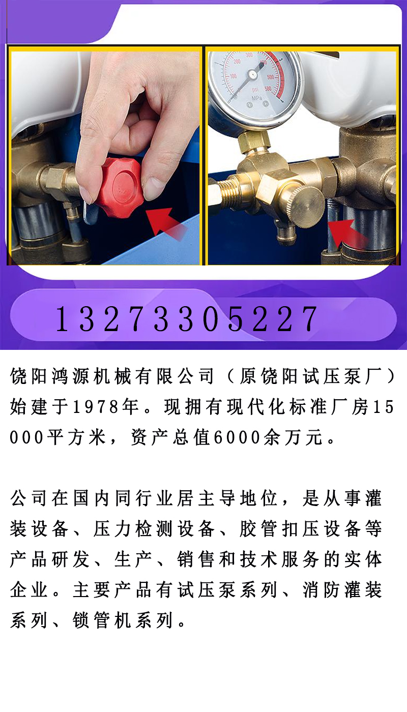 饶阳鸿源机械有限公司生产的试压泵系列主要有计算机控制试压泵、高压气动试压泵、大流量试压泵、数显控制试压泵、遥控试压泵、电动试压泵、手动试压泵等;消防灌装系列主要有干粉灌装机、大口径胶管扣压、二氧化碳灌装机、氮气灌装机等生产或维修灭火器的设备;锁管机系列主要有数控锁管机、胶管锁头机、钢管扣压机、多功能锁管机、绝缘子锁头机、高压锁管机、扣管机等。