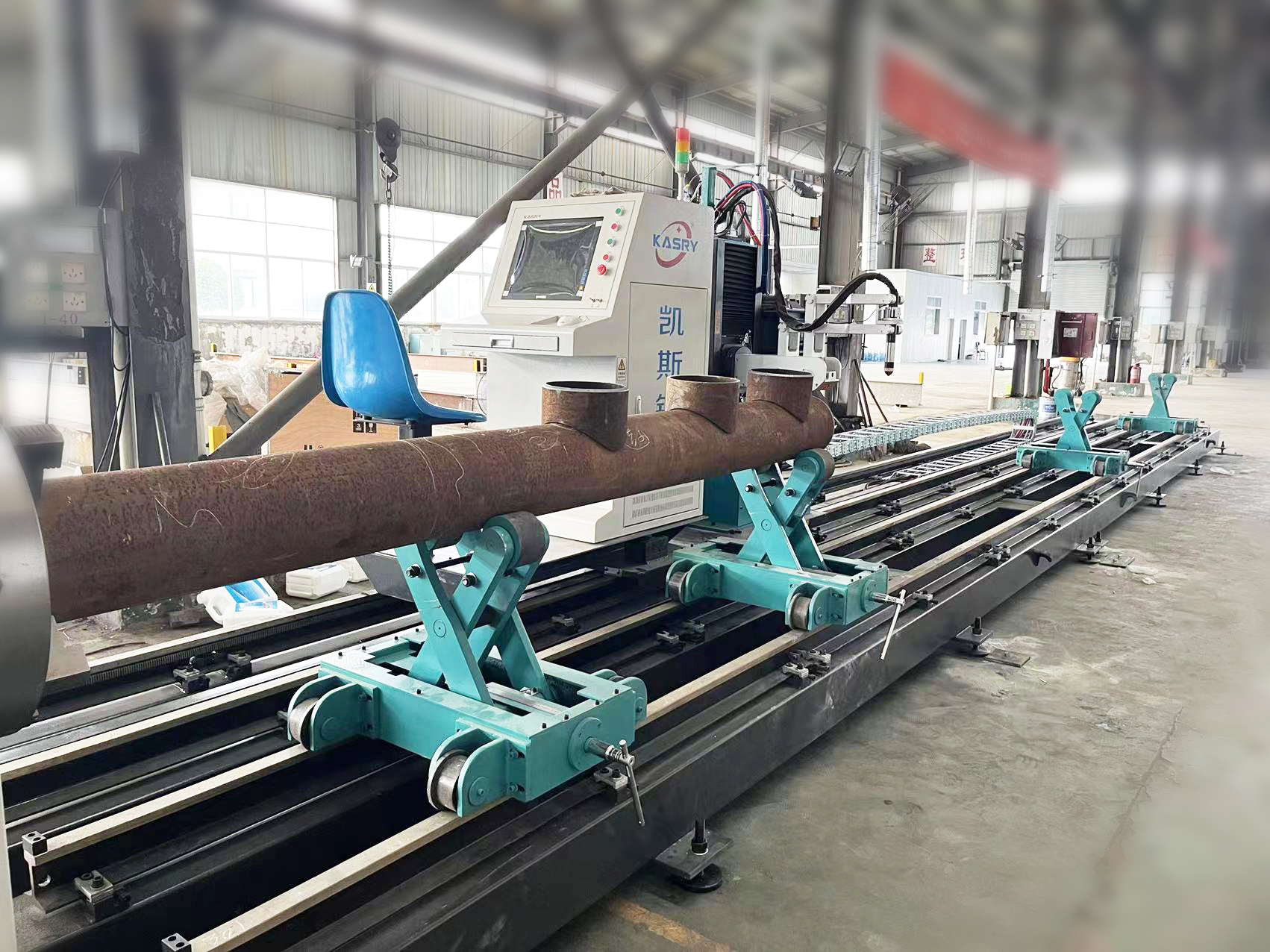 凯斯锐五轴相贯线切割机可以实现在主管上切多个不同方向、不同直径的相贯线孔。在支管端部切相贯线端头、在管子端部切割斜截端面、在圆管上切割焊接弯头,虾米节的两端斜截断面。