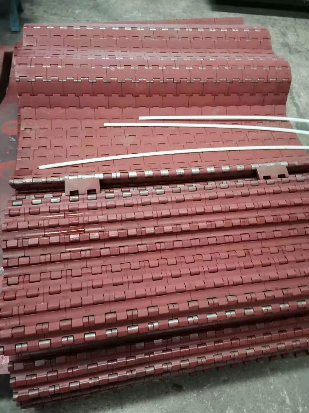 给煤机甲带又称钢带、履带,是甲带式给煤机传动部分中主要配件,甲带 由增强尼龙高轴销串接新式甲片组成。新式甲片为精细铸造,材质为Mn16或高合金钢。Mn16材料具有良好的性、韧性,增强尼龙穿条具有良好的性和自润滑性,大大提高了甲带的耐冲击性,当甲带受到物料剧烈冲击时,首先其自身结构形式就将冲击力由冲击点甲片经甲带尼龙穿条向四周扩散,其次,其下的胶带自身变形也吸收一定的冲击载荷。并同时将剩余的冲击载荷传导给缓冲托辊及缓冲托辊座进行吸收,这样就很好的提高了给煤机的抗冲击力。