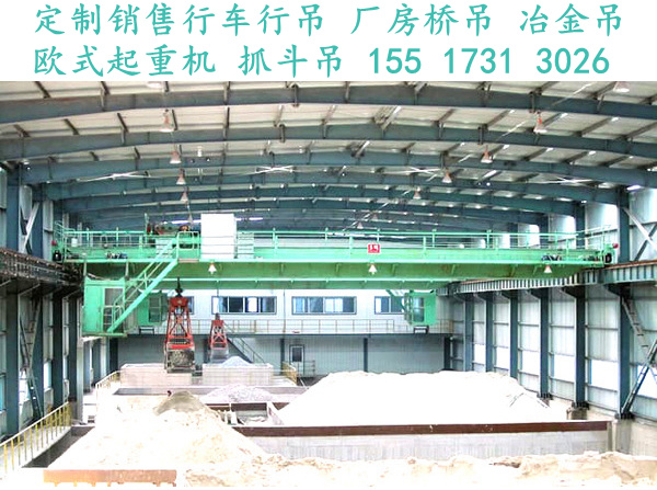 江苏南京行车行吊厂家出厂价销售的抓斗起重机主要由箱形桥架、抓斗小车、大车运行机构、司机室和电气控制系统组成。取物装置为能抓取散装物料的抓斗。其取物装置是抓斗,抓斗是一种用来抓取物料的设备,其抓取速度快、效率高,使用效果非常好。抓斗在选择过程中也要注意技巧,这样买到的设备使用周期才更长。