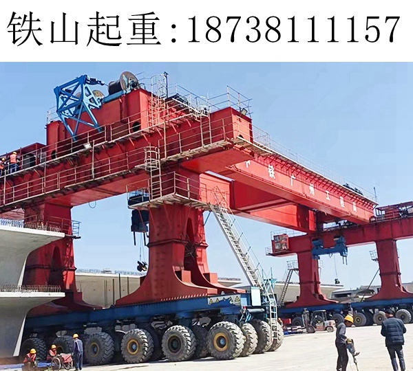 技术参数:用途预制场箱吊装、移位,A3,整机工作级别M4,机构工作级别900t,额定起吊能力40m-48m(净跨35m-43m),跨度10m,起升高度0-0.5m/min(重载)0-1.5m/min(空载),起升速度0-17m/min(重载)0-35m/min(空载)爬坡能力1.5%,适应路面混凝土、沥青路面或压实的级配石路面,轮胎规格/数量26.5R25/48,驱动轴/从动轴8/16,支撑油缸规格200t行程400mm,轴载质量54000kg,接地比压≤7.0kg f/cm2,平台升降行程?150mm,允许风压工作状态250N/m2 非工作状态:800N/m2,整机外形尺寸44.8m-52m)15.9m13.6m,整机功率300kw,整机质量400t-500t。