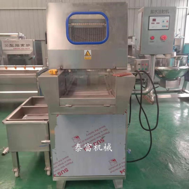 盐水注射机通过带有针孔的注射针将盐水槽内盐水注入大块产品中,使盐水渗透产品整体,是制作火腿、烤肉、酱肉、鸡类、鸭类、鹅类、牛肉等肉类制品的设备。盐水注射机通常搭配滚揉机一起使用,盐水注射机减少了产品滚揉的工艺时间,滚揉机解决了盐水注射机注射后盐水渗透不均匀的问题,两者相辅相成。盐水注射机是将盐水、淀粉、大豆蛋白及辅料注入肉中充分腌渍,依靠的技术、利用机械装置将腌制剂通过注射针注射入产品,使之在全自动盐水注射机内均匀分布达到快速腌制、增加调味、保持肉食营养、强化口感的目的。150**5447--0262