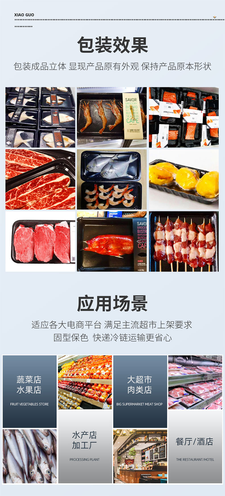 目前行业内的生鲜冷链,主要有放干冰和氮气两种方式。干冰最多可以保持两天,氮气最多也只能撑一周。而贴体包装,可以确保肉类在0-4℃的环境下新鲜保存21天。