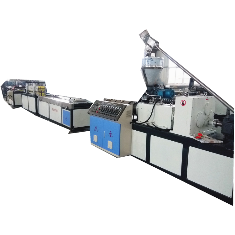PVC扣板设备,采用专门设计的锥形双螺杆挤出机,进口变频器调速,进口温控仪表技术先进,由混合机,模具,真空定型台,牵引机,切割机和堆放架等组成,它具有结构合理、温控精度高,操作方便可靠,配置精度高,性能稳定,生产效率高,塑化均匀等特点,主要用于生产PVC型材,例如天花板,装饰条,地板,屋檐口,板材,窗子,门边框和门板。
