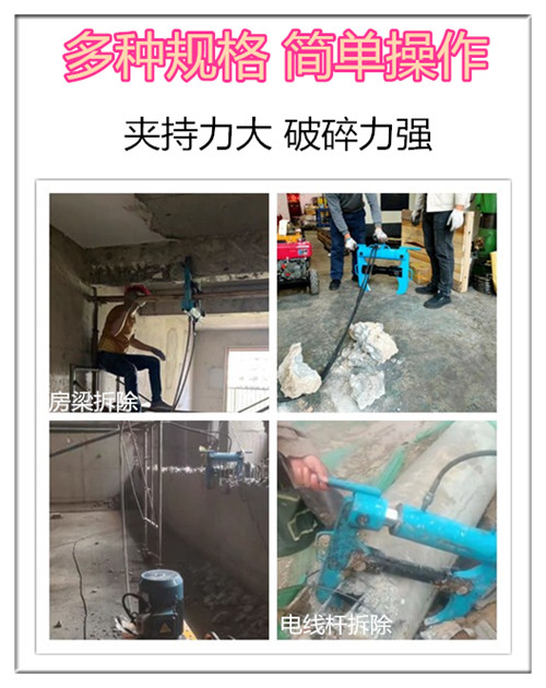 液压钳有钳体、销轴、连接体、手把、油缸及泵站等组成。当泵站供给油缸无杆腔高压油时,活塞杆伸出,推动钳口收缩,破碎钢筋混凝土结构。当泵站向有杆腔供油时,活塞杆收回,钳口松开。油缸完成一次正反向供油,液压钳完成一次循环作业,正反向不断供油,液压钳反复作功,液压破碎钳供应商,从而实现不断破碎混凝土结构。高压经向柱塞泵由电机直接带动泵轴旋转,在倾斜盘作用下柱塞沿经向往复运动,液压油经进油阀吸入,从排油阀排出进入系统油路。液压钳通常有一个铝合金外壳,它的刀刃由热轧钢锻造制成。液压剪主要用来剪切如片状金属和塑料之类的材料。通常它被用来剪开汽车以及其他交通工具以解救被困乘客。与液压扩张器一样,液压剪也可以由汽油驱动装置提供动力。救生颚系统可以由电力、空气或液压驱动。