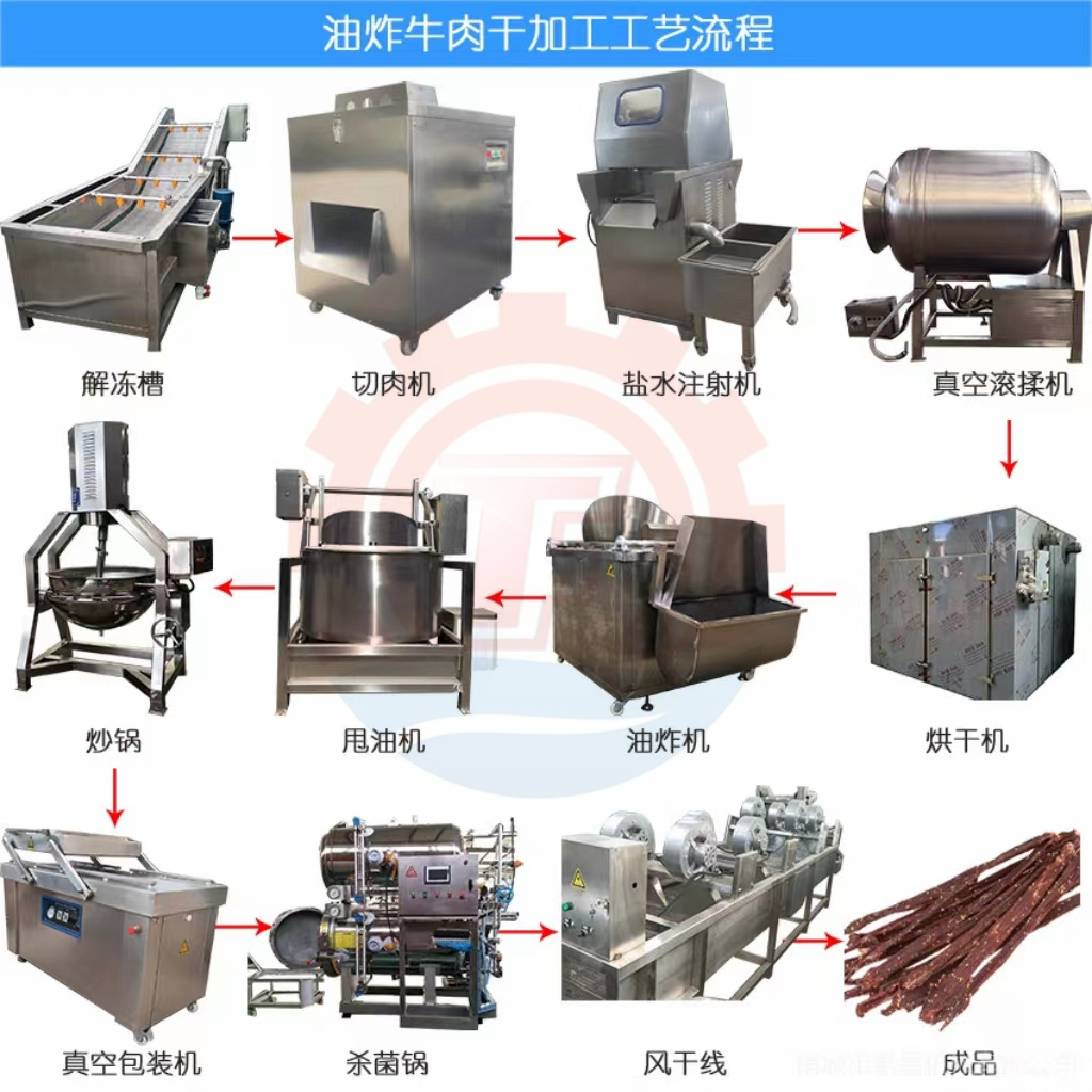 工厂专用牛肉干生产线设备主要有解冻机、盐水注射机、切条机、滚揉机、油炸锅、八角拌料机、烘干房、包装机、巴士杀菌锅、风干机等。