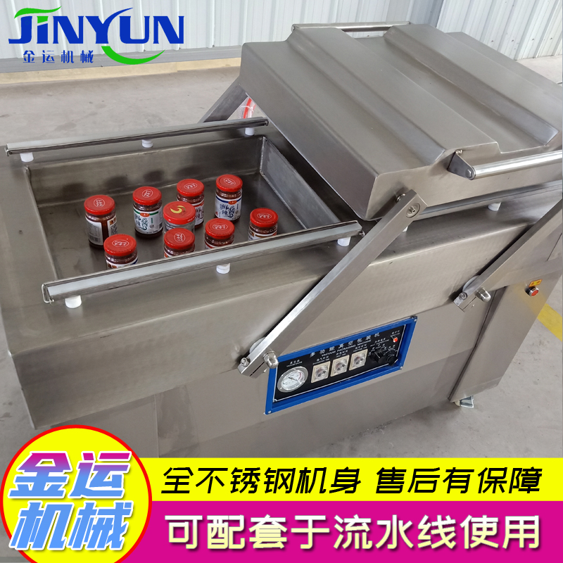 双室真空包装机是包装机的一种,利用其真空室对包装进行抽空,然后再充入惰性气体以达到防腐保质的目的。真空包装机是将包装袋内抽成真空,然后封口,使袋内形成真空,从而可使包装物品达到隔氧、保鲜、防潮、防锈、防蚀、防虫、防污染等的目的,有效的延长保质期、保鲜期、便于存放和运输。食品级SUS304不锈钢制作,不氧化、不生锈。性能稳定,不变形。全程自动化控制,简单易操作。真空度高,寿命长。