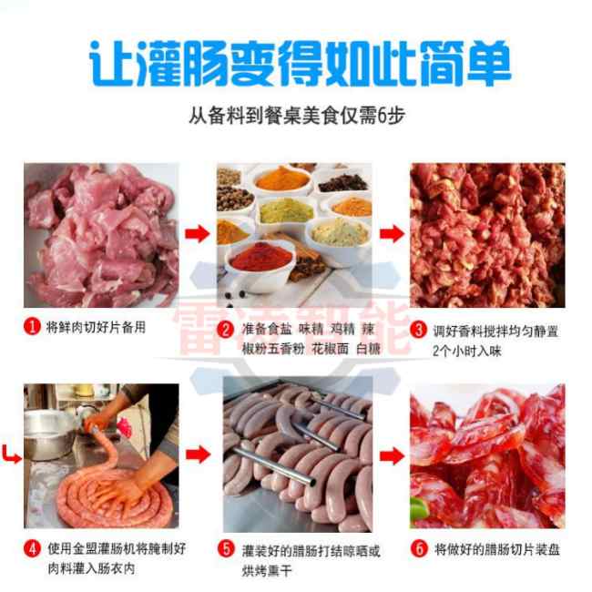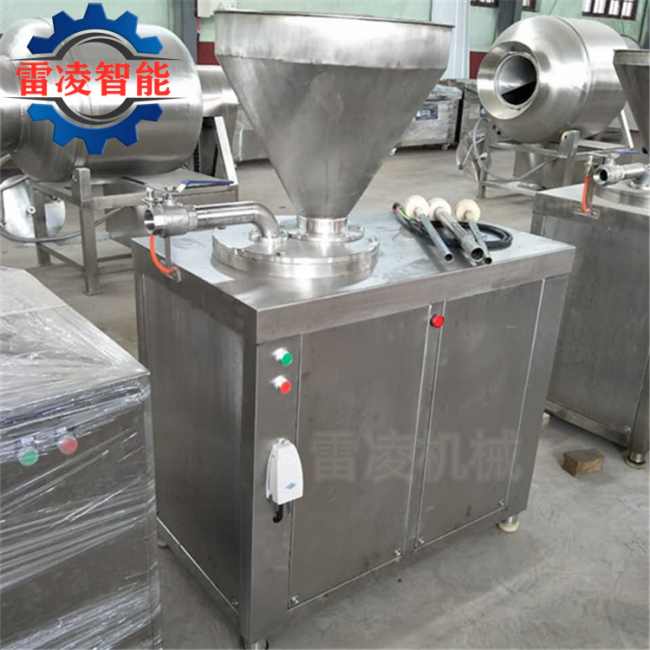 本系列灌肠机(食品加工机械厂家Tel:150*5447-0262)可灌制各种肠类如火腿肠、肉泥肠、大众肠、红肠、菜肠、粉肠及松江肠等。主要的原料,经过脂制(或未经脂制),绞碎或者是暂化成肉糜状并混合,以畜禽肉为种原料,用灌填入肠衣或人造肠衣中成型,后可进行熏蒸加工。该机适用于动物肠衣、蛋白肠衣、塑料肠衣的灌制。