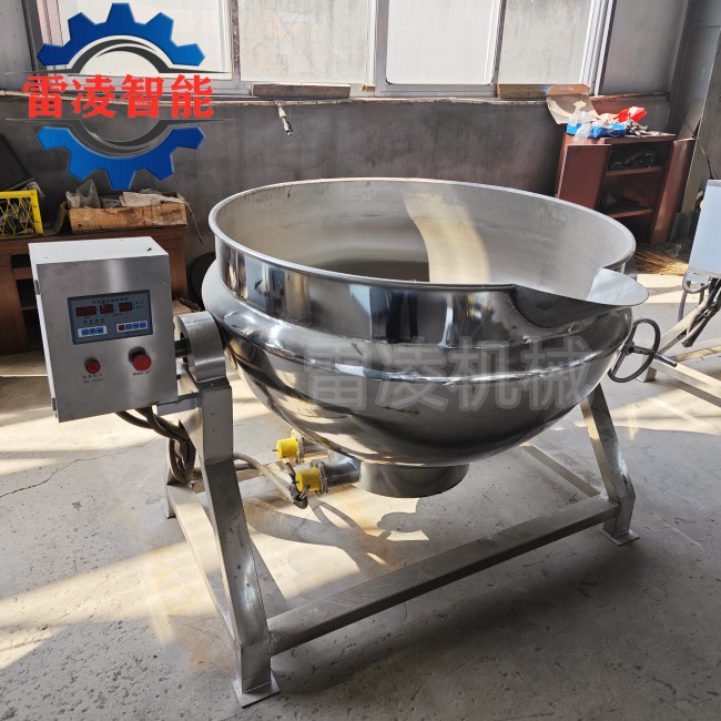 锅体是由内外球形锅体组成的双层结构形式,中间夹层通入蒸汽加热。搅拌器刮边搅拌,机械传动。出料方式为下出料口出料,另一方面,夹层锅是一种被广泛使用的相当成熟的食品机械。