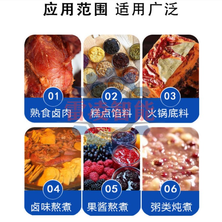 夹层锅可用于烧水,炒菜,熬稀饭,熬粥,熬汤,煮饭,化糖,化胶,熬油,煮面,炒馅料(比如豆沙馅,莲蓉馅,绿豆馅等),煮笋干,煮卤制品(比如豆腐干,肉制品,毛豆等),卤制品(比如鸡爪,鸡翅,卤蛋,鸭爪,鸭脖,猪耳朵等),酱油等食品行业。
