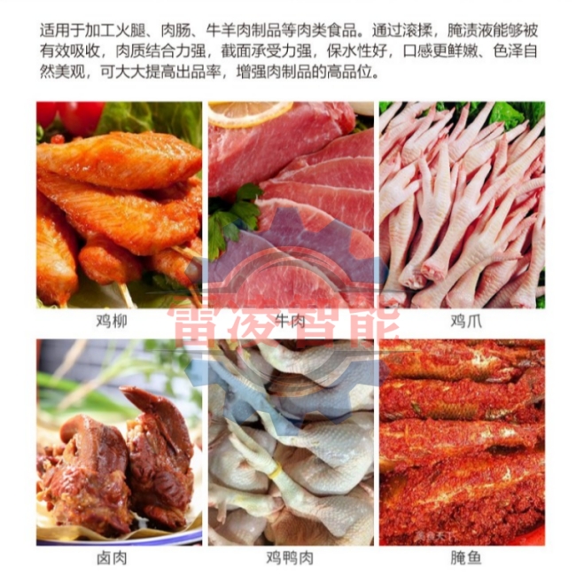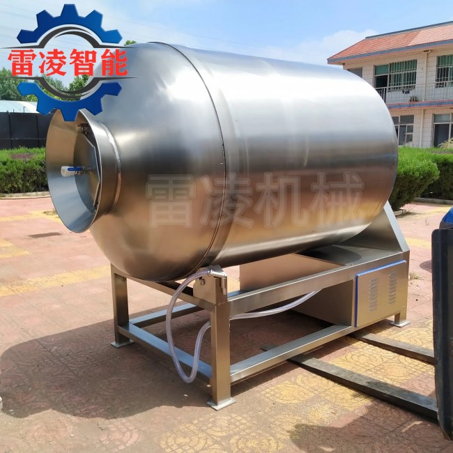 诸城雷凌智能装备有限公司生产的真空滚揉机在连续式滚动的作用下,使肉被滚筒中的挡板带到高处,然后自由落下,相互撞击,摔打,从而达到AN摩、腌渍作用。经过连续旋转,食物之间互相揉擦,每块肉都可以充分腌渍,使食物更加的入味。滚揉机通过不断的滚揉和相互挤压,腌渍液被肉充分地吸收,增强肉的结合力及弹性,使原来僵硬的肉块软化、肌肉组织松弛、腌渍液容易渗透和扩散、肉发色均匀。