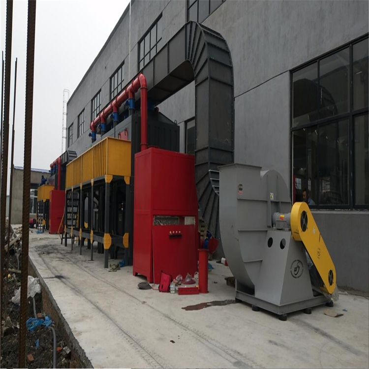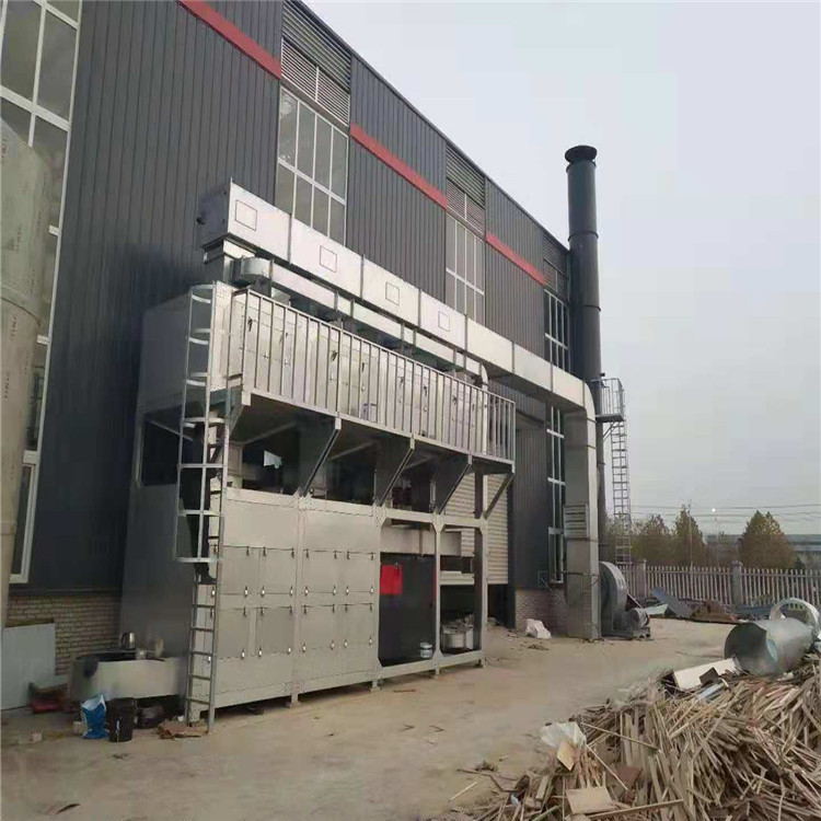 催化燃烧:利用催化剂做中间体,使有机气体在较低的温度下,变成无害的水和二氧化碳气体,即:将饱和的活性炭解析出来的有机气体通过脱附引风机作用送入净化装置,(活性炭脱附下来的有机溶剂为气体)首先通过除尘阻火器系统,然后进入换热器,再送入到加热室,通过加热装置,使气体达到燃烧反应温度,再通过催化床的作用,使有机气体分解成二氧化碳和水,再进入换热器与低温气体进行热交换,使进入的气体温度升高达到反应温度,如达不到反应温度,这样加热系统就可以通过自控系统实现补偿加热,使它完全燃烧,这样节省了能源,废气有效去除率达标排放,符合国家排放标准;催化净化效率97%以上。