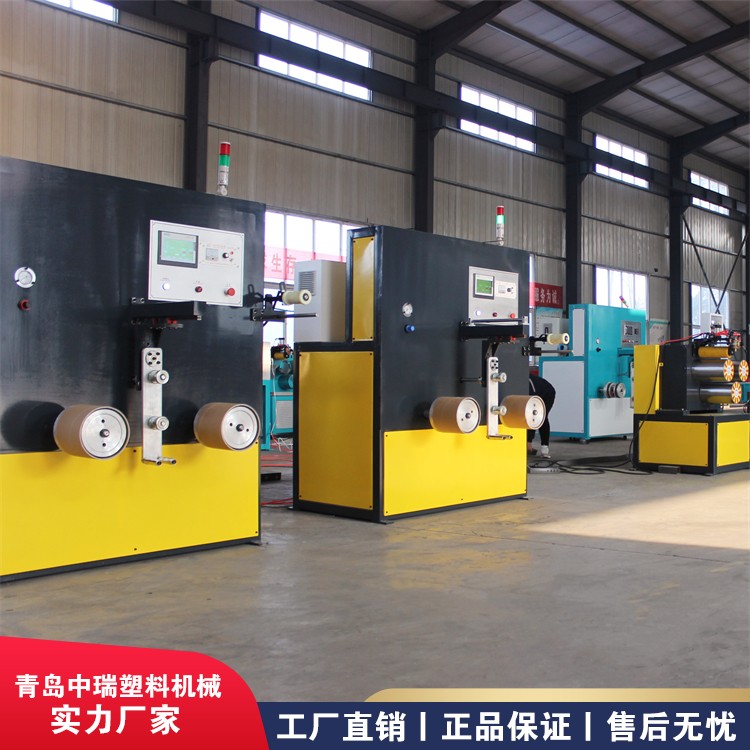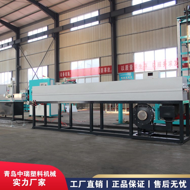 打包带设备生产线由干燥料斗、SJ65/30单螺杆挤出机、一出二机头模具 【根据客户要求配一出一或/一出二条模具及挤出机】、冷却水槽、牵引机、加热烘箱、二牵引机、印字机、压花机、冷却水箱及缠绕定型支架、三牵牵引机、卷取机组成,生产线采用自动化控制,自动化程度高,设备稳定,操作简便,生产效率高。该生产线调整或更换模具可以生产多种规格、尺寸、形状、厚度的PP打包带。