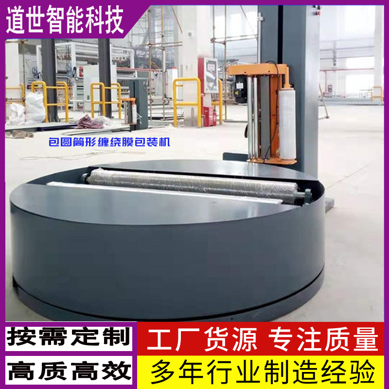 圆筒型缠绕机纸卷无纺布缠绕膜打包机转台旋转带动圆筒状货物整体转动的同时,由转台上的两根动力托辊带动圆筒状货物自转,进而实现对货物全封闭缠绕裹包的设备。自动化圆筒纸缠绕机PLC控制,人机界面操作系统,缠绕层数可调。圆筒缠绕机对圆形货物进行缠绕裹包,有利于货物的储存、运输及周转,具有防尘、防潮、保洁的作用。自动化圆筒纸缠绕机包装成本低、效率高、提升包装档次。常用于大轴纸、特种纸等造纸和无纺布行业。圆筒型缠绕机的基本原理是将货物放在旋转的平台上,通过缠绕膜将它们紧密地固定在一起,形成一个紧密的包装,避免货物在运输过程中损坏或者发生移位。