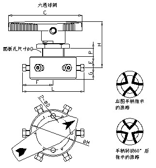 4.手柄方向指示的流路及间隔120?的流路是两两连通的,参见图示。