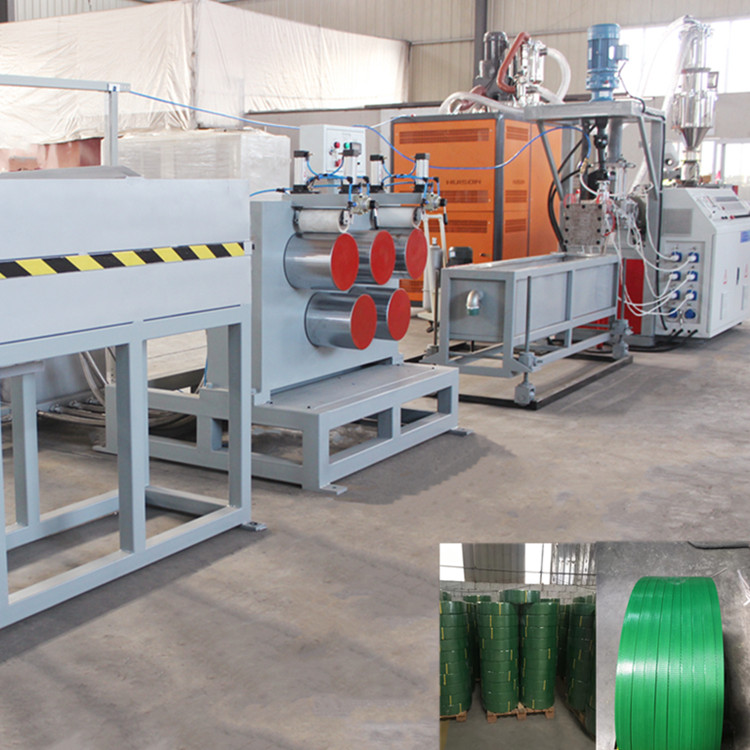该生产线使用PET废旧矿泉水、雪碧、可乐等瓶片作为原料生产,废旧资源再利用,成本低,效益高,绿色环保。整机设计紧凑合理、操作便捷,采用电脑控制系统,用于对熔体温度、压力、挤出速度、扭矩、牵引等实时控制,可生产轧花等特殊要求的塑钢带。该机组生产的打包带,抗拉力可以媲美铁皮打包带,还具有防水、防潮、抗腐蚀的特点。