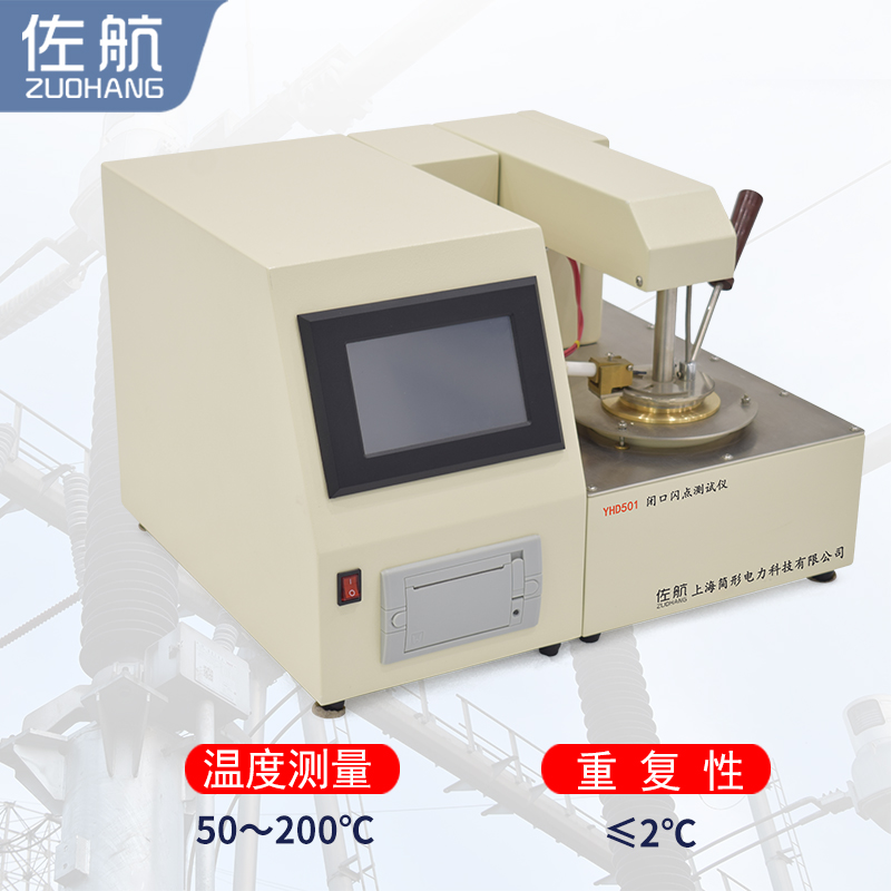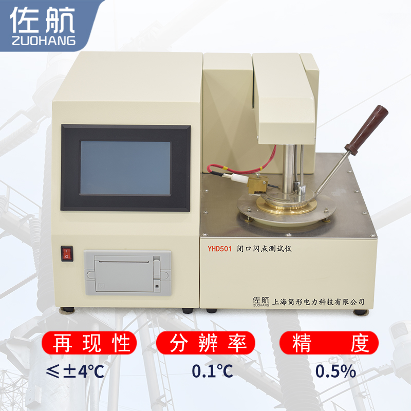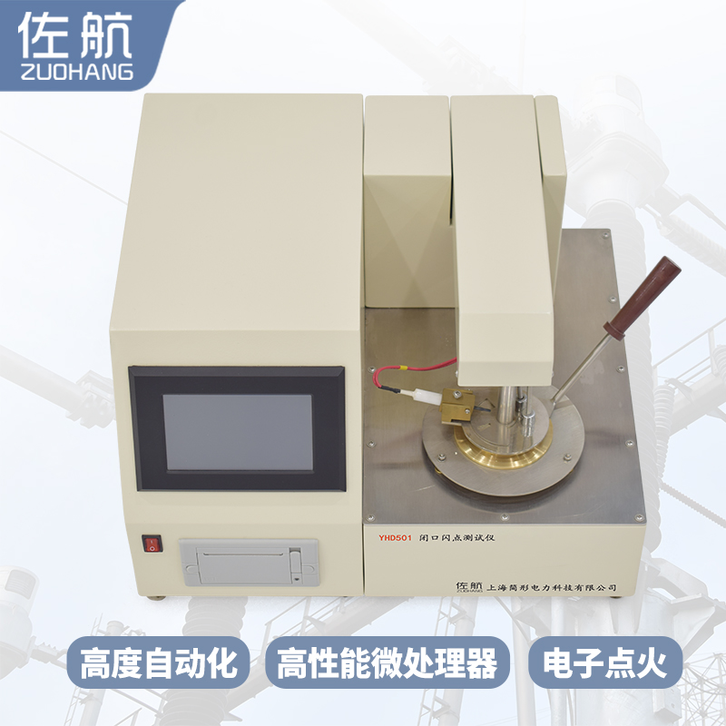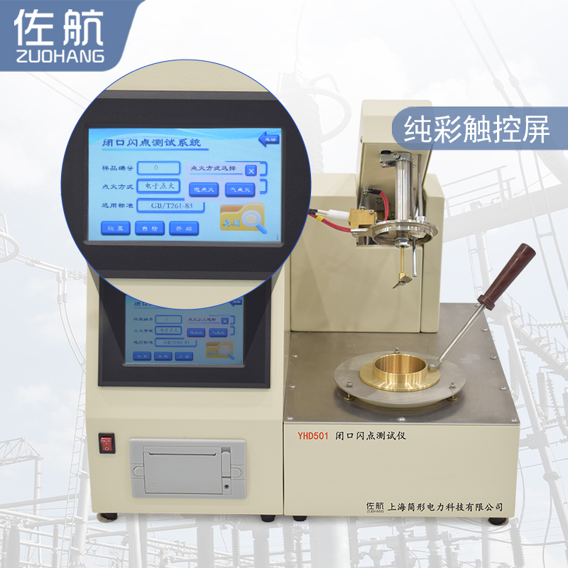佐航YHD501全自动闭口闪点测试仪,用于测定石油产品的闭口闪点值。采用国外的先进技术,液晶TET纯彩触控屏,全中文显示人机对话界面,对可预值温度、试油标号、大气压强、试验日期等参数,具有提示菜单提示式输入,方便快捷,开放式、模糊控制集成软件,模块化结构,符合GB/T261-2008和GB/T261-83标准。是理想的进口仪器替代产品。广泛应用于铁路,航空,电力,石油行业及科研部门等。