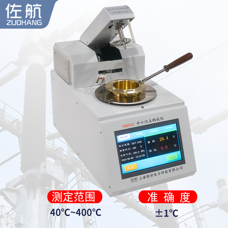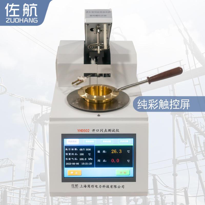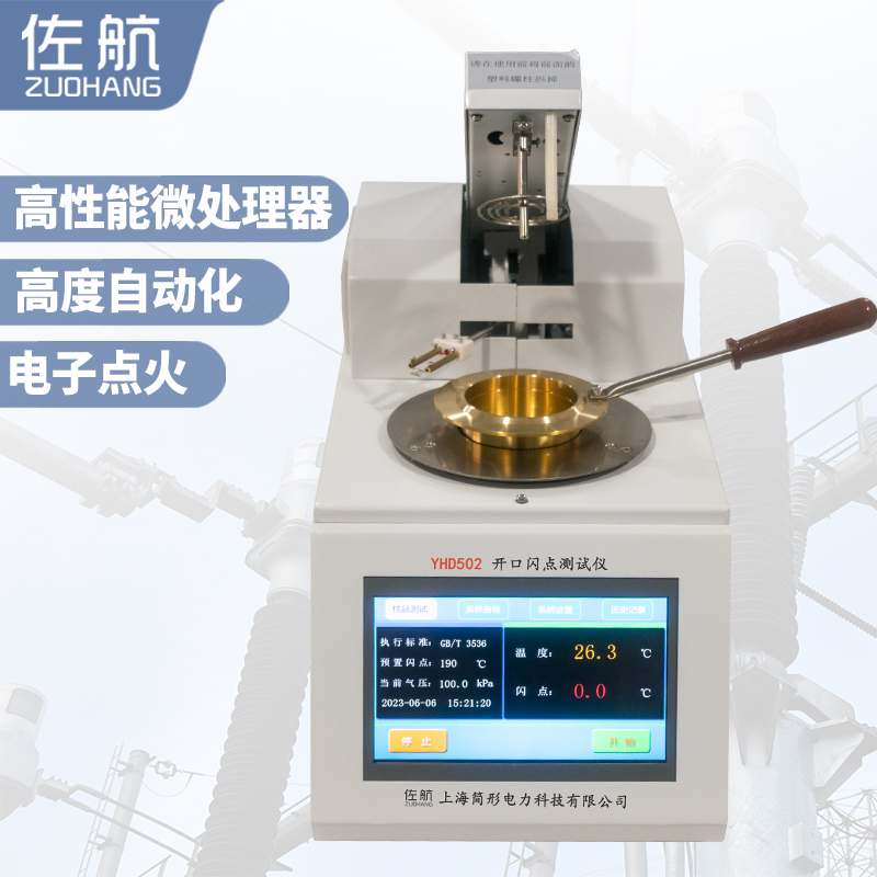 佐航YHD502全自动开口闪点测定仪,用来测定石油产品的开口闪点值。仪器采用电点火方式,无需任何可燃性气体,符合GB3536-2008、GB267-88的方法要求。采用ARM系列高性能微处理器,电擦除存储器(可存储上千条数据记录),7寸彩色液晶显示器及触摸屏,PID自整定等多项最新技术。