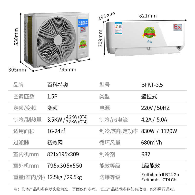 百科特奥防爆空调,杭州防爆空调。经国家防爆电气检测中心认证:确定防爆标志为:防爆等级:ExdmbibⅡBT4 ,其含义为:Ex-防爆,d-隔爆型,mb-浇封b类,ib-本质安全型b类,IIB-工厂用B级防爆,T4-电气设备温度组别。产品制造标准符合:GB3836.1、GB3836.2、GB3836.4、GB3836.9等。