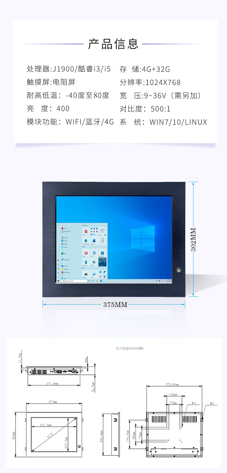 5.电脑供电宽压在9V-30V之间,出厂配有12V5A电源适配器.