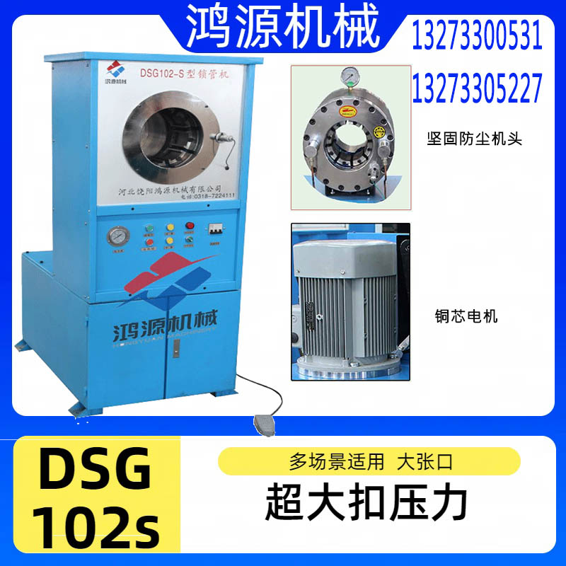 我厂生产的DSG-102/S型锁管机适用于工农业和工程机械液压传动用高压胶管、纤维管、塑料管总成的扣压加工。具有体积小、重量轻、功能多、开模快、易操作、好维修等优点。