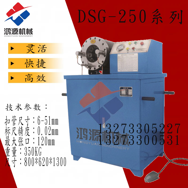 DSG-51锁管机DSG-51锁管机|锁管机|扣管机|胶管扣压机|缩管机|液压锁管机我厂生产的DSG-51A/B型锁管机适用于工业、农业和工程机械液压传动用高压胶管、纤维管、塑料管总成的扣压加工。具有体积小、重量轻、功能多、开模快、易操作、好维修等优点。
