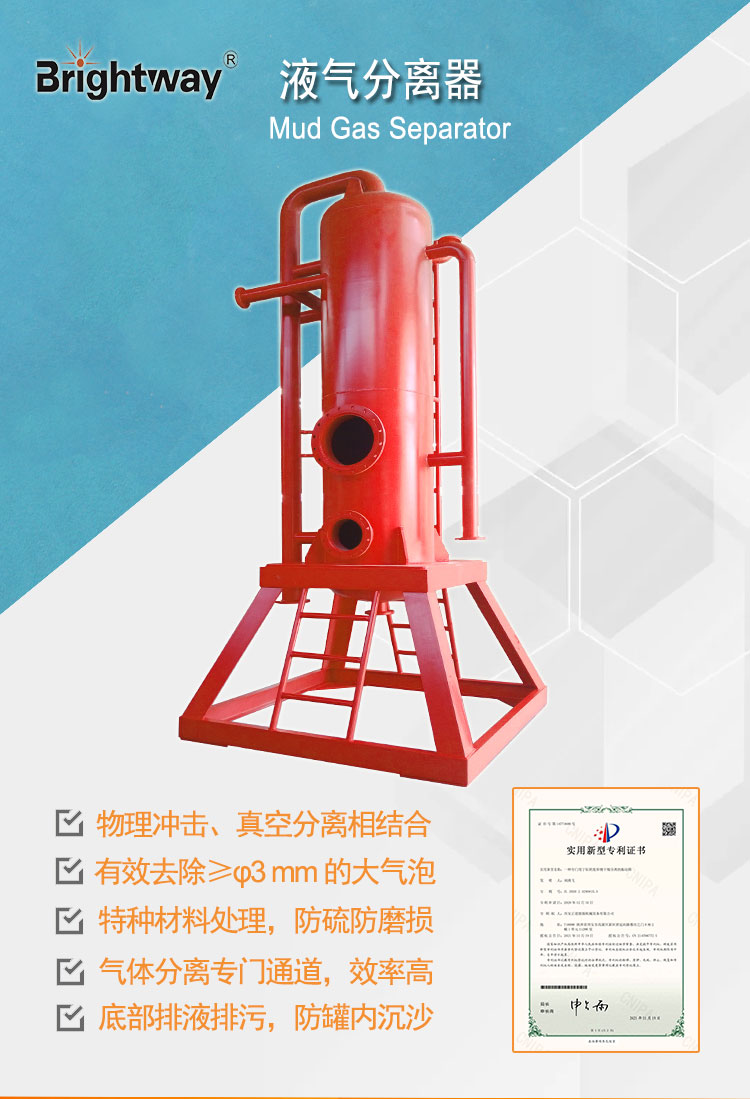 钻井液液气分离器是气侵钻井液初级脱气的专用设备,液气分离器是与节流管汇配套使用,用于脱离钻井液中游离气体,可应用于欠平衡钻井和含硫化氢气体的钻井液处理。清除气侵钻井液中直径大约在≥φ3mm的大气泡。这些大气泡是指大部分充满井眼环空某段的钻井液中的膨胀性气体,若不除掉,容易引起井涌,甚至喷出钻盘表面。液气分离器能有效防止有害气体的侵蚀,保证人机安全生产。发生气侵的钻井液的比重、粘度会大幅度的偏离正常参数,不能满足钻井要求,严重时将引起井涌、甚至发生井喷事故;液气分离器与电子点火燃烧装置联合使用可对气侵钻井液进行有效的处理。