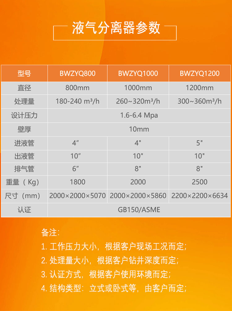 正道能源BWZYQ系列液气分离器常规型号包括 BWZYQ800,BWZYQ1000,BWZYQ1200,有立式液气分离器和卧式液气分离器两种类型,具体液气分离器参数规格参见下方技术参数表。