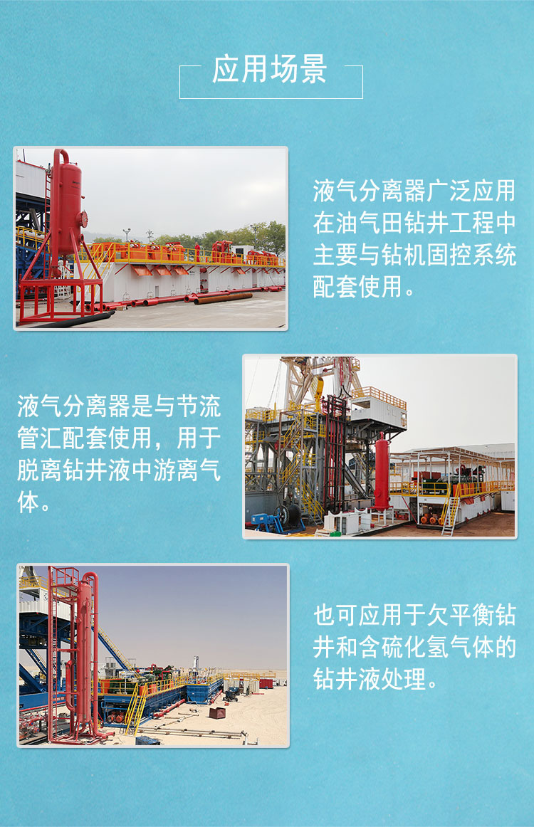正道能源液气分离器可用于油气田钻井固控系统中、欠平衡钻井和含硫化氢气体的钻井液处理中等项目场景中。