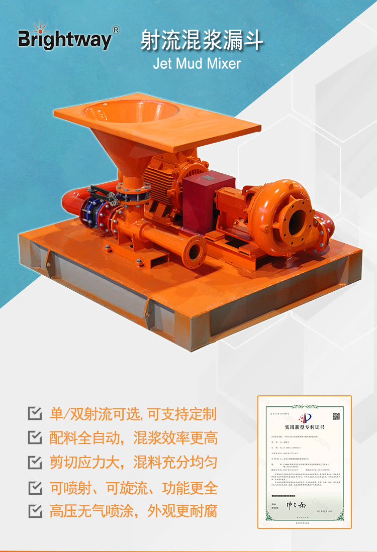 正道能源BWSLH系列射流混浆装置配置有:大口径进料漏斗,优质文丘里管线,高品质砂泵,选型规格多,具有混浆能力大,能耗小,效率高,药品剪切效果理想,皮实耐用,性能安全可靠,移运方便等优点。