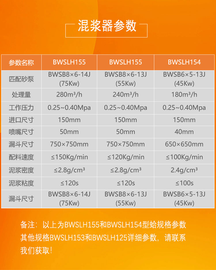 正道能源BWSLH系列射流混浆装置型号包括:BWSLH155,BWSLH154,BWSLH153,BWSLH125等,漏斗类型包括:单射流和双射流混浆装置;独立撬座式射流混浆装置和一体组合式,具体射流混浆装置规格参见下方技术参数表。