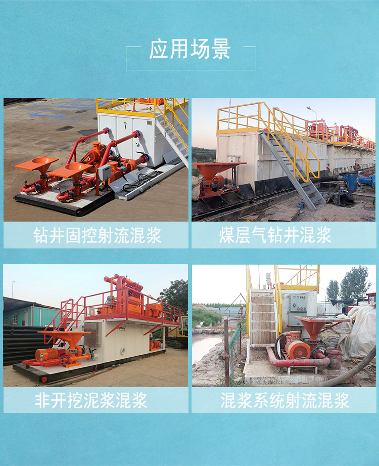 射流混浆装置由一台砂泵和一台射流式混合漏斗用管汇阀门联接安装在一个底座上组成,射流混浆装置主要被用来配制或增加钻井液总量,改变钻井液密度、粘度、失水,是加重钻井液专用油田设备之一。钻井泥浆处理过程中需要将钻井液材料(膨润土,重晶石粉等)和相应的化学添加剂(聚合物等)投入钻井液循环罐中,射流混浆装置起到剪切和混合大量块状化学药剂,让其充分分散和钻井液均匀混合,以避免造成钻井液材料和化学添加剂大量沉淀或团聚。射流混合漏斗通常应用到石油钻井固控混浆射流,非开挖工程领域泥浆混合射流等。