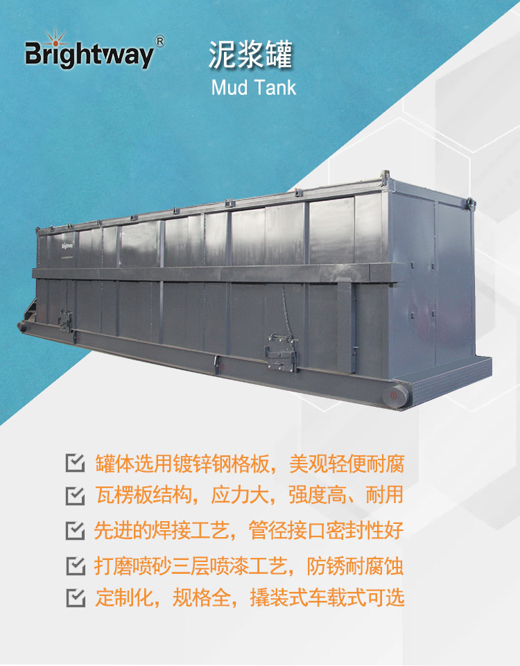 泥浆罐、钻井用泥浆罐、 固控泥浆罐是钻机泥浆循环系统用来储存和混拌泥浆的一种设备。泥浆罐循环系统根据罐底部形状分为方形罐和锥形罐。罐体采用平板锥形结构或瓦楞结构,钢板与型钢组焊。在钻井固控系统中,泥浆罐罐面配备有大量罐面设备,包括:钻井液振动筛、真空除气器、除砂器、除泥器,除砂除泥一体机、液气分离器、搅拌器、砂泵、剪切泵、离心机、电子点火装置、混合漏斗、射流混浆装置、泥浆枪等。以及防护辅件:护栏 走道 钢格板防砂棚、防雨棚,罐内设置暖气保温管线。