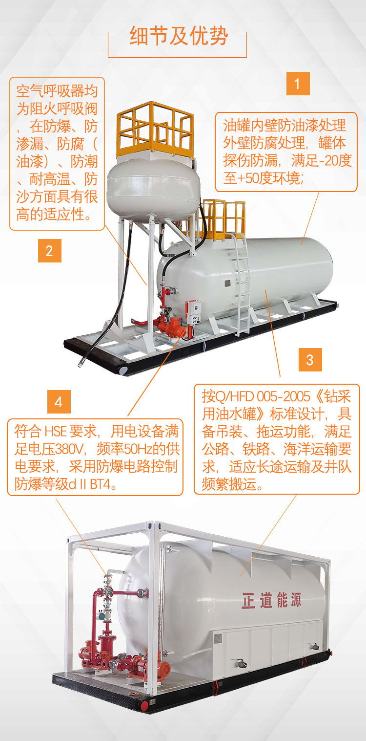 正道能源储油罐严格按照:Q/HFD 005-2005《钻采用油水罐》标准设计制造。适用于-20度至 50度的环境温度。具备吊装、拖运功能,满足公路、铁路、海洋运输要求,适应长途运输及井队频繁搬运。高架油罐系统布置紧凑合理,整体移运方便。