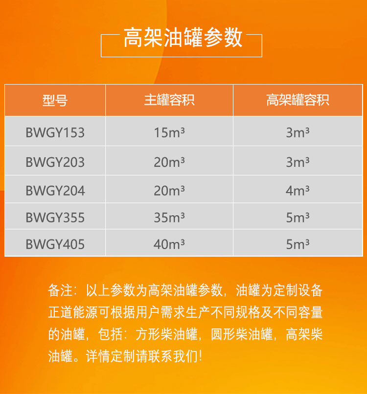油罐 高架油罐为定制设备,正道能源可以根据用户需求,生产不同规格及不同容量的油罐,20 3m?-40 5m?高架柴油罐,包括:方形柴油罐,圆形柴油罐,高架柴油罐。可根据图纸定制,详情定制请联系我们!以下为:正道能源BWGY系列高架油罐设备详细参数。