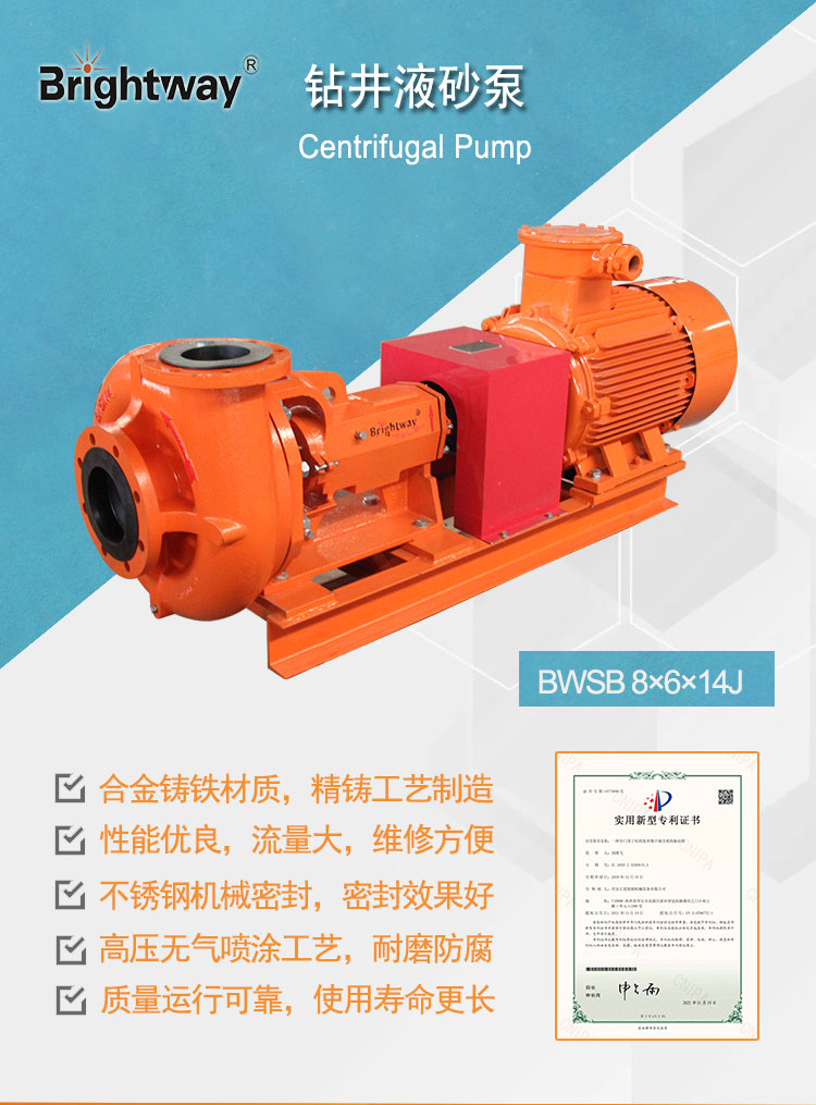 正道能源BWSB系列钻井液砂泵包括卧式砂泵和立式砂泵,型号规格全,选型方便快捷,性能优良,可抽磨料、粘性、腐蚀性液体等物料,工作运行可靠,使用寿命长,可广泛应用到石油钻井固控 非开挖工程 污泥脱水工程等领域。是输送钻井液 泥浆 污泥的理想选择。