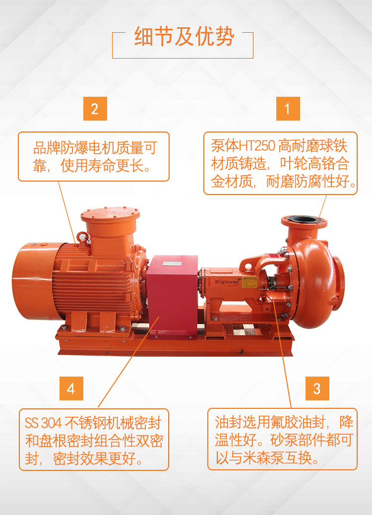 砂泵电机选用南阳防爆或其他国产品牌电机,质量可靠,使用寿命长。