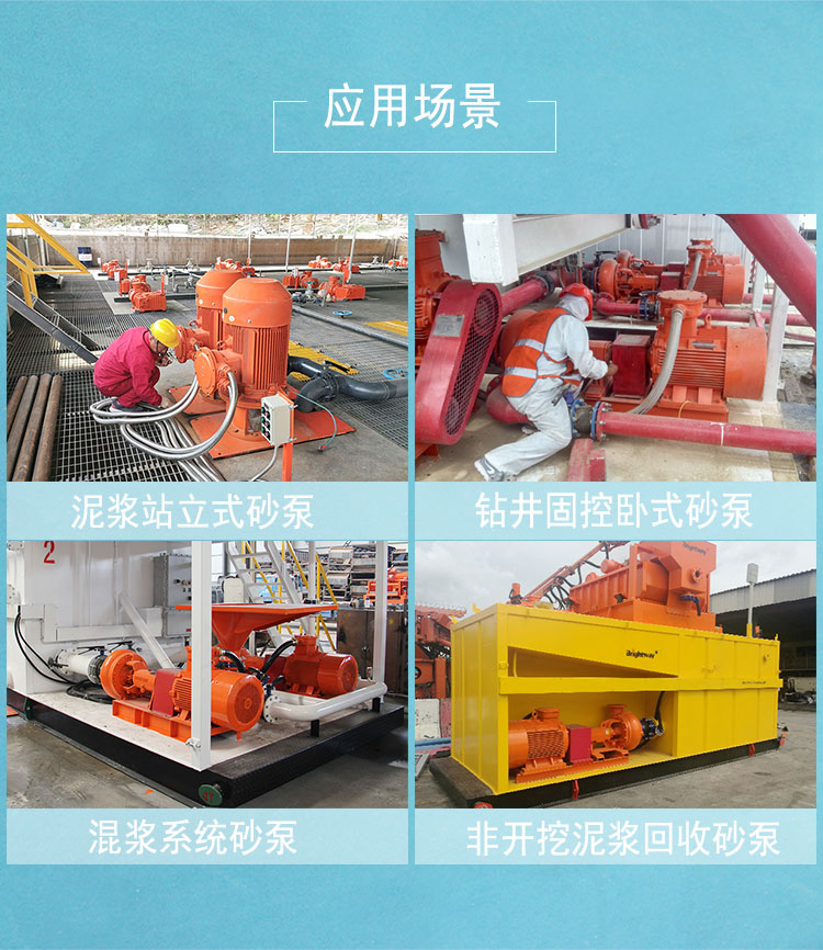 正道能源应用场景:钻井液砂泵应用场景:可用于泥浆站(立式砂泵)、钻井固控(卧式砂泵)、混浆系统、非开挖泥浆回收等不同行业项目场景中。