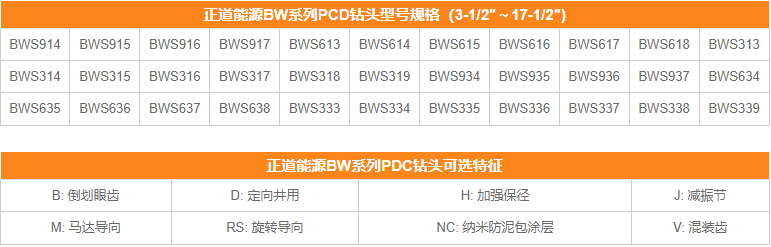 备注:正道能源BWS系列金刚石PDC钻头适合:中等硬度地层到硬地层或软硬互层的地层钻进,可配合旋转导向、马达等钻进。