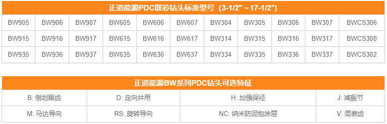 正道能源PDC取芯钻头标准件型号表:
