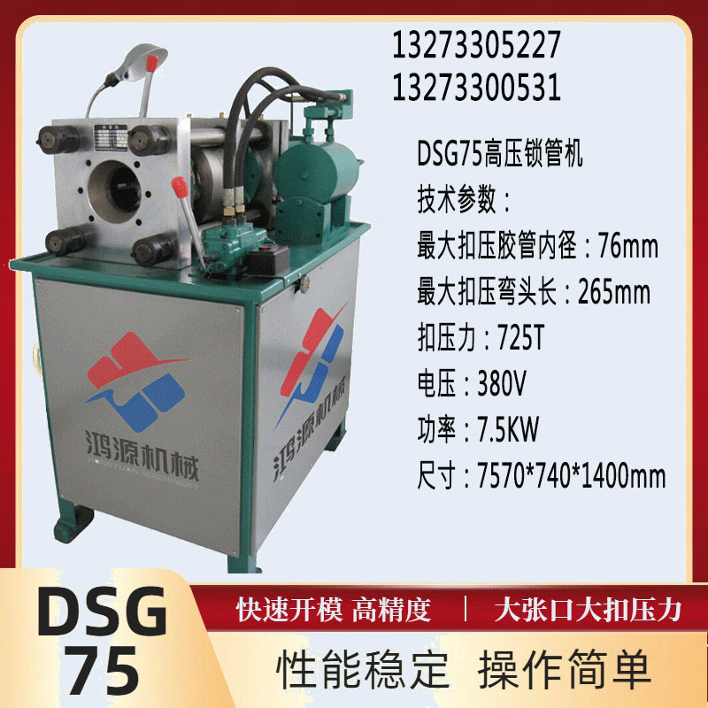 市面上所说的锁管机、扣管机、胶管扣压机、缩管机、液压锁管机是一个概念,是大家对于锁管机的不同称呼。我公司生产多种锁管机,例如4D-SY型锁管机、DSG-S型多功能锁管机 、3DSY-S型锁管机等适用于工农业和工程机械液压传动用高压胶管、纤维管、塑料管总成的扣压加工。具有体积小、重量轻、功能多、开模快、易操作、好维修等优点。