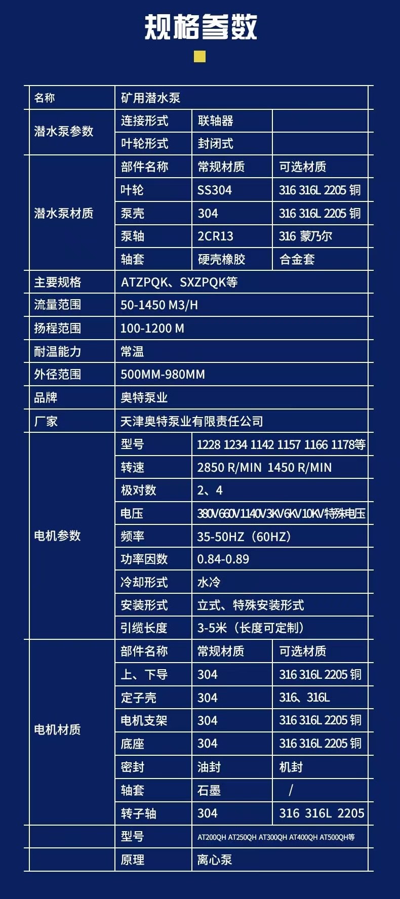 QK矿用潜水泵的大功率设计,使得它在面对大量积水或深井排水时,能够迅速而高效地完成任务,大大提升了矿井作业的安全性与效率。同时,其高压性能更是为矿井排水提供了强有力的保障,即便是在水位较深、压力较大的情况下,也能轻松应对,确保矿井内部环境的干燥与安全。