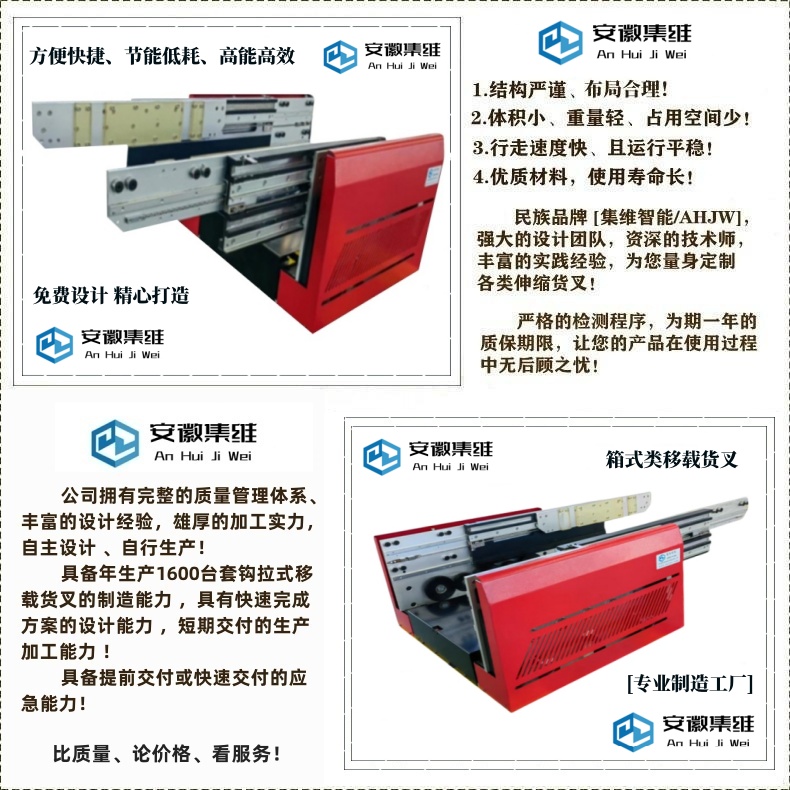 工厂简介:安徽集维智能装备有限公司[马鞍山市]是一家集研发、设计、生产、销售为一体的堆垛机伸缩货叉生产制造企业,拥有多位资历深厚的工程设计师和经验丰富的技术人员,全套的机加工设备,完全自主设计、自主生产,具备年生产1600台套各类伸缩货叉[移载货叉]的制造能力,具有快速完成方案的设计能力,以及短期交付的生产加工能力,具备提前交付或快速交付的应急能力!