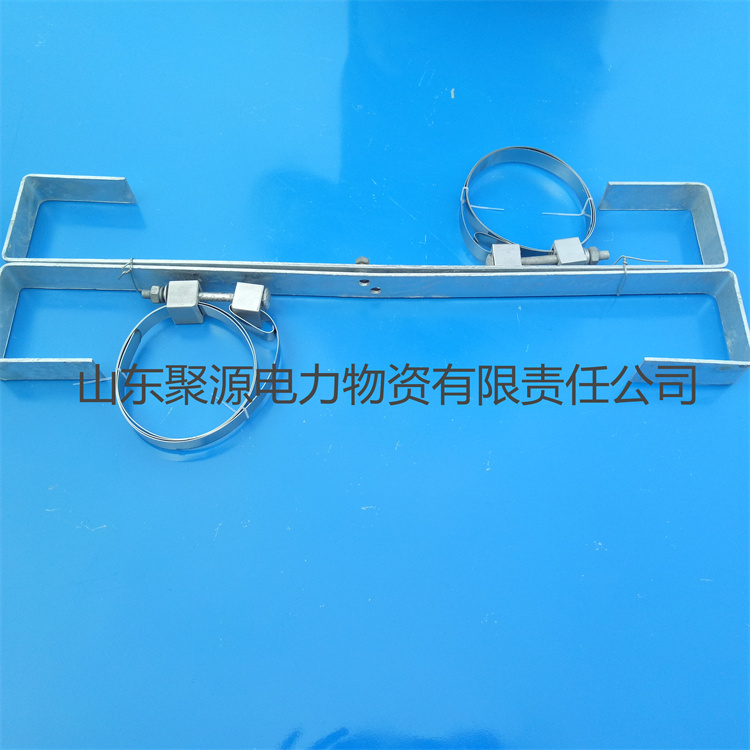 3、用钢带抱箍缠绕电杆,并用螺栓将余缆架紧固到钢带抱箍上,注意钢带要叠压,防止滑脱。