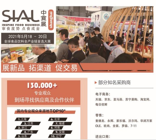 2021中食展SIALChina 中国国际食品和饮料展览会2021中食展SIALChina中国国际食品和饮料展览会/全球食品饮料全产业链首选大展时间:2021年5月18-20日地点:上海新国际博览中心(浦东新区龙阳路2345号)20万平米展览面积,17个展馆(满馆)4300参展企业,130000专715 人浏览