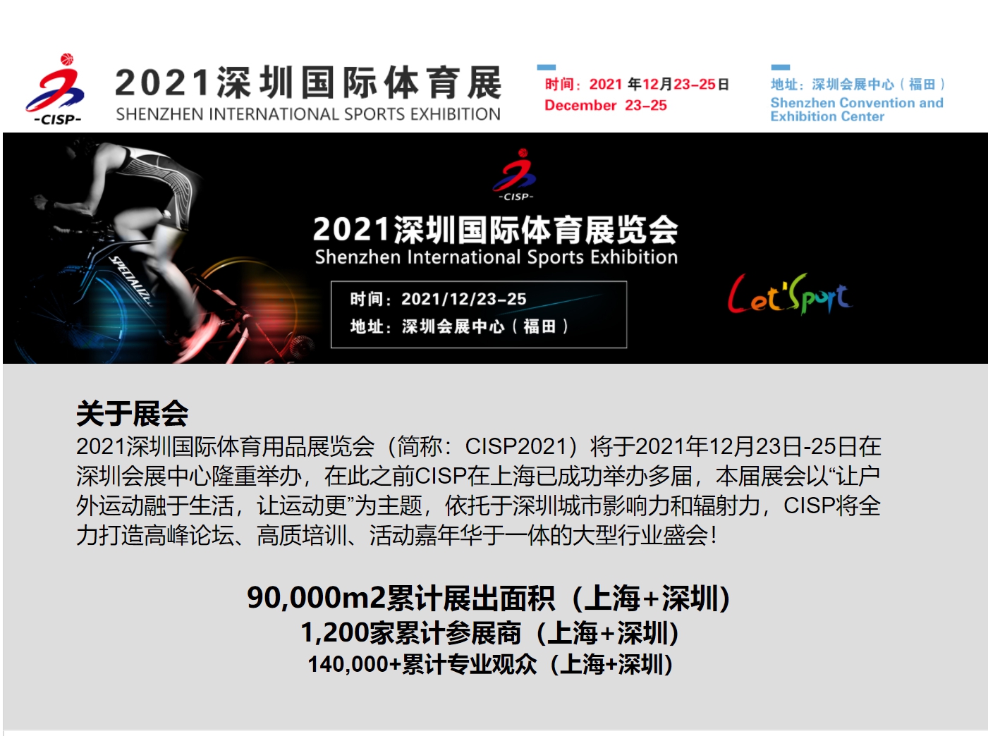 2021深圳国际体育展2021深圳国际体育展SHENZHENINTERNATIONALSPORTSEXHIBITION—同期举办户外用品展———地点:深圳会展中心(福田馆)时间:2021年12月23—12月25日140,000观众(上海深圳)1,200家累计参展1095 人浏览