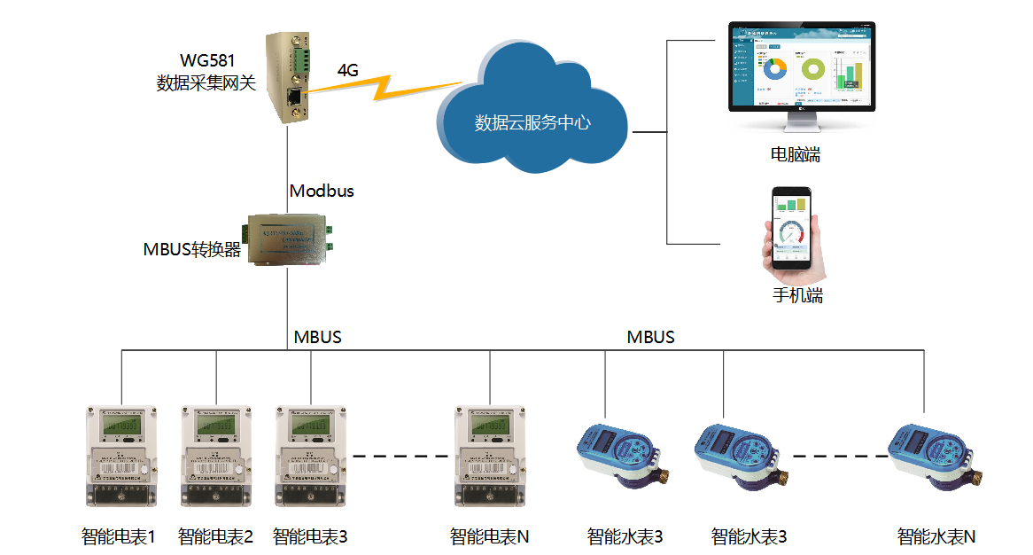 电表采集网关,通过串口与电表(基于modbus系列或电表645或水表协议)物理连接,采集仪表的数据,在网关上进行边缘计算,数据标准化以后以MQTT的json串的格式,通过4G网络上网,传到分布式数据云平台,通过电脑端或手机端,实时监控或控制。